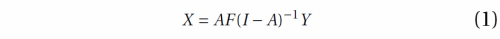 wobei X der Gesamtausgangsvektor, I die Identitätsmatrix, A die Transaktionskoeffizientmatrix und Y die abschließende Nachfrage in dem Referenzjahr (2011) und in dem Zieljahr (2050) ist. AF ist der Vektor der Arbeitsplatzfaktoren, die aus der aktuellen Anzahl von Vollzeitäquivalenten (VZA) pro Aktivität auf dem Mehrwert (MW) für die gegebene Aktivität j , wie in Gl. (2) definiert, abgeleitet werden können (2):