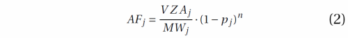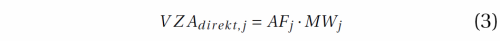 wobei VZAdirekt,j die direkten Arbeitsplätze in Vollzeitäquivalenten für ein gegebenes Jahr sind, AFj der Arbeitsplatzfaktor ist und MW der neue Mehrwert ist.